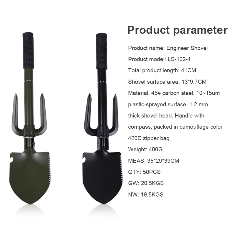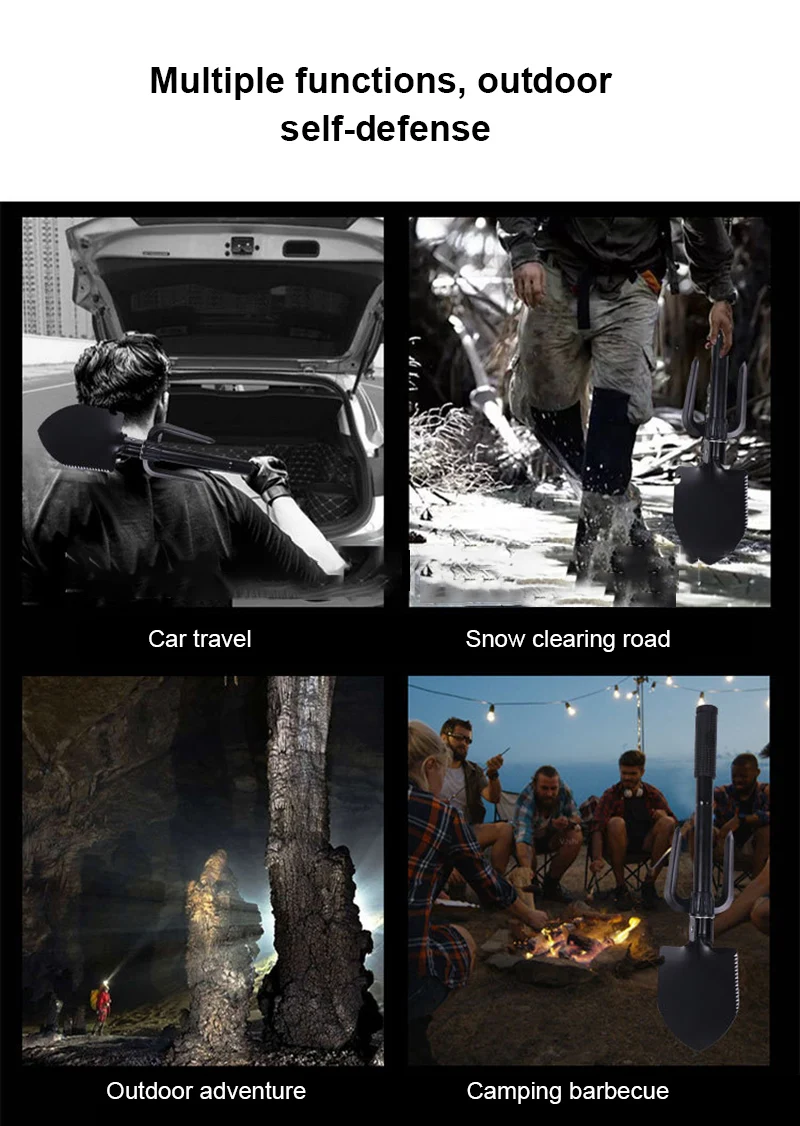 2. Various uses, very suitable for camping, camping, mountaineering, exploration, tourism, home garden, scientific research and other outdoor activities good helper, with spade, rake, saw, nail slot and other functions.
