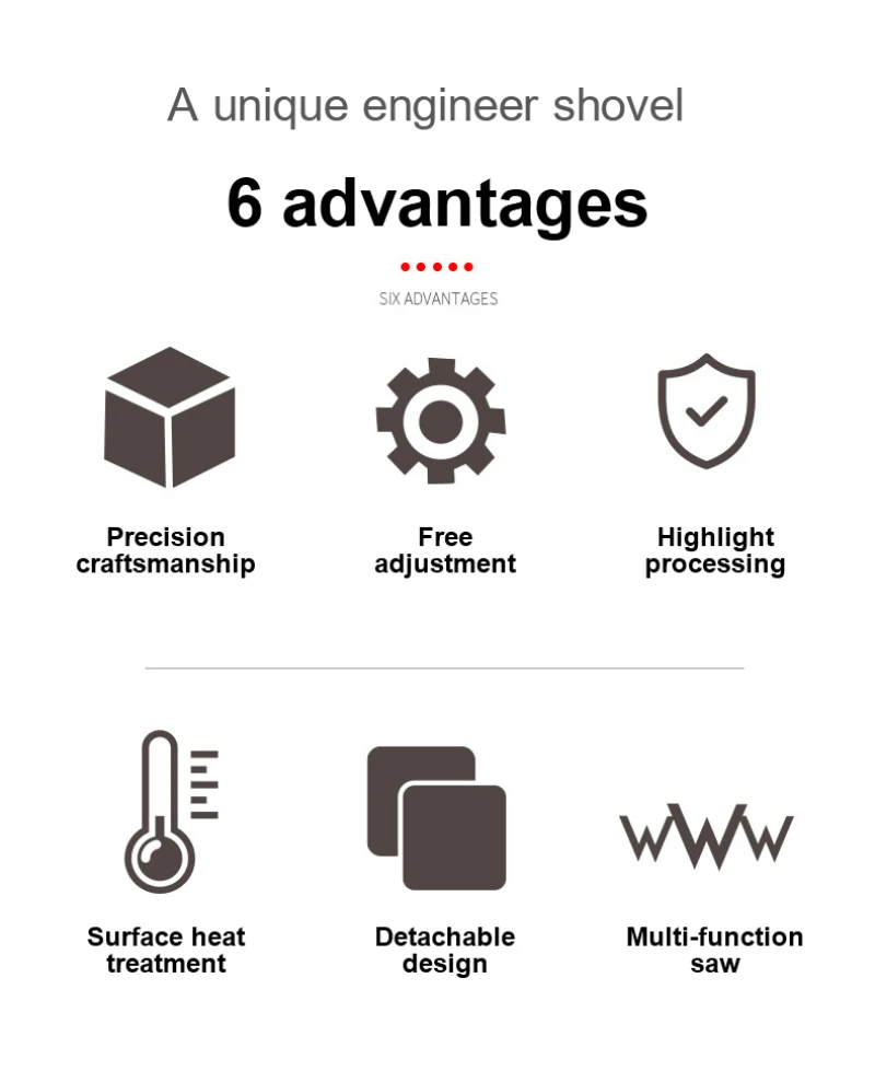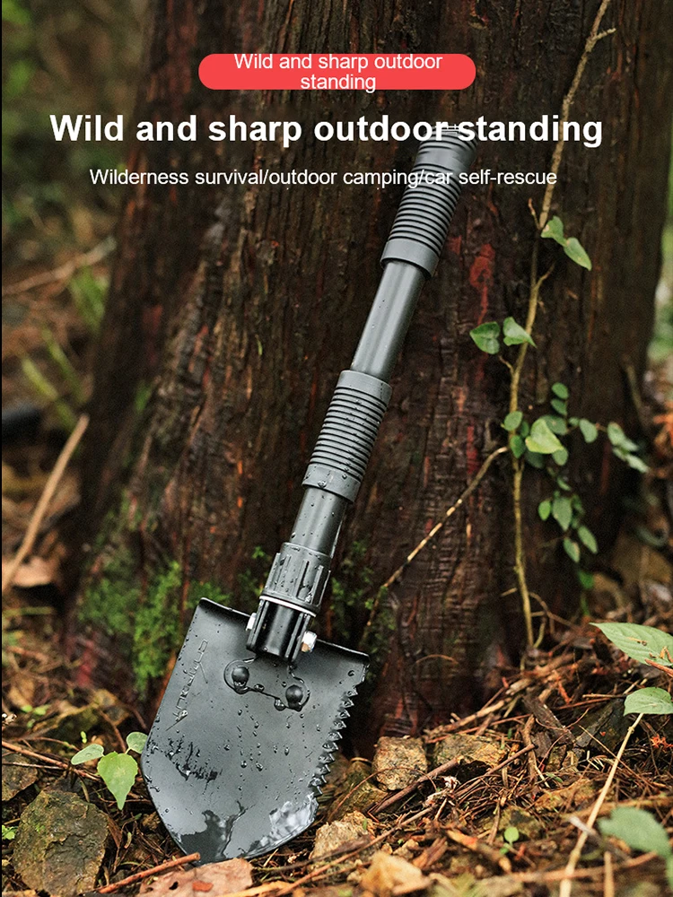 This product is a multi-functional engineer shovel for outdoor camping, wild and sharp, and is always available outdoors. Ergonomic handle design, comfortable grip, with anti-skid rubber sleeve, saving time and effort, convenient and practical. Humanized design, you can use the nut to adjust the tools you want at will, fast and convenient. Adjust at will, safe and convenient. Using electrostatic spray powder processing technology. Improve the smoothness and fineness of the product surface finish. Surface heat treatment improves hardness and toughness. High-gloss treatment, anti-rust and anti-corrosion. Small and portable, fast storage, does not take up too much backpack space, it is your good companion for outdoor travel.