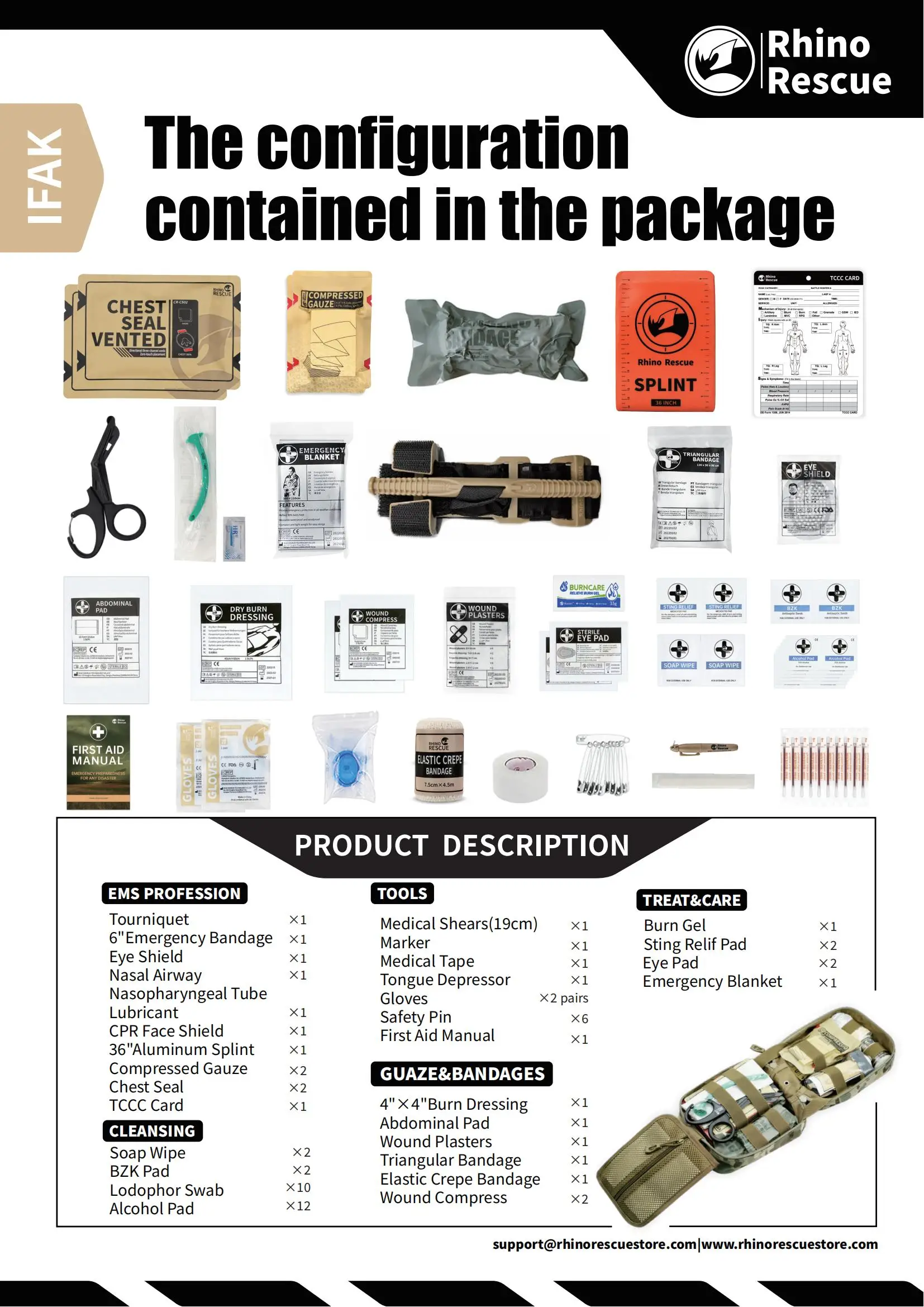 This kit contains the most use friendly, compact and popular survival and first aid supplies for massive bleeding control on the market, which includes: military combat tourniquet, tactical Israeli pressure dressing, and compressed gauze.